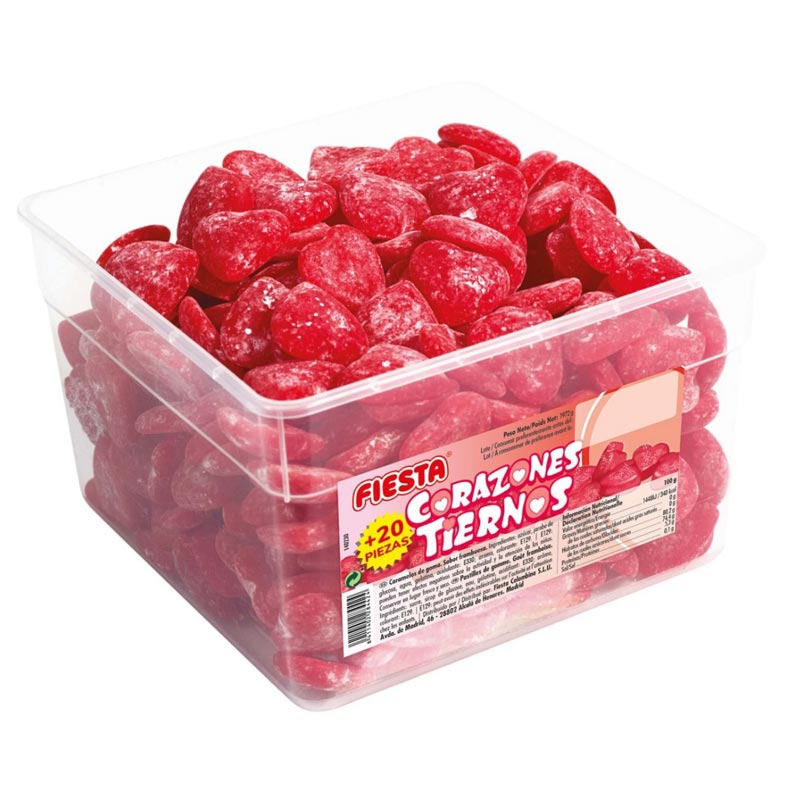 Tarro con 270 unidades de Corazones Tiernos Fiesta, caramelos de goma sabor frambuesa.